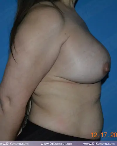 Note the rise in her nipple height without any incisions on the breast. A full mastopexy would have been able to raise the nipples more, but that would involve incisions on the front of the breast.
