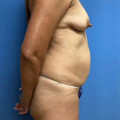 This 53 year old female, weighing 180 lbs and 5’9 in height desired a mommy makeover. Was mostly concerned with her abdomen and her breasts. She underwent an abdominoplasty via a drainless technique, breast augmentation and nipple reduction. Had ideal implants of 675cc in the right and 705cc placed in the left breast.