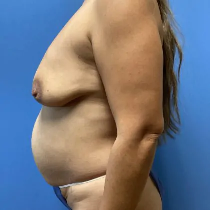 This is a 37 year old female, weighing 143 lbs and 5’ 3” height desires a mommy makeover. She has had two children of her own and became a surrogate mother as well. She is now concerned with the fullness of her abdomen as well as deflation of her breasts. She underwent abdominoplasty with rectus suturing, liposuction of the lateral abdomen, fat grafting to the breasts, and a mastopexy. She then proceeded to wait 6 months to then do a breast augmentation of Mentor high profile memory gel BOOST silicone 545cc implants. Was previously a 36B now she is wearing a G cup bra.